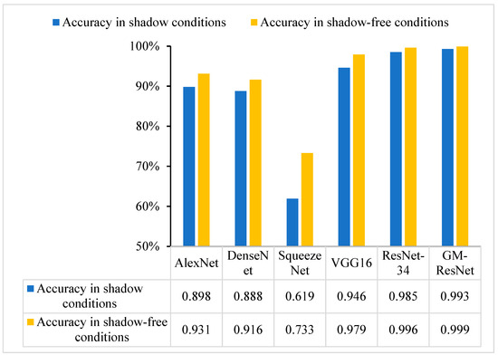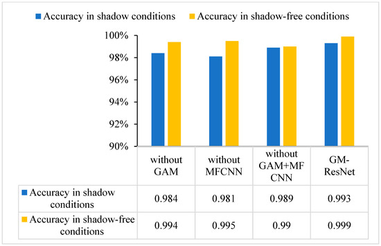 In addition, in order to verify the impact of different modules of the GM-ResNet on the performance of the model, we supplemented the ablation experiment and conducted comparative tests without the GAM, without the MFCNN, without the GAM + MFCNN and the GM-ResNet, respectively. In order to enrich the test results, we also conducted the same test under the shadow condition, and the test results are shown in Figure 14.