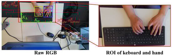 Then, the bounding box that includes the hand and keyboard (i.e., RoI) is calculated based on the center of the left hand and keyboard size: