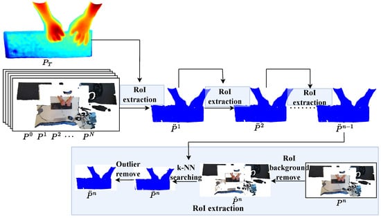 where represents a set of points with points captured from the frame; indicates the ground-detection operation with distance threshold ; is the point cloud removed around the hand and keyboard. Then, we used the RoI to search the k-nearest neighbor points of :