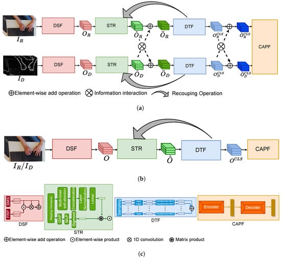 KD-Net with different inputs. It consists of four modules: the Decoupled Spatial Feature (DSF) module, the Decoupled Temporal Feature (DTF) module, the Spatiotemporal Recoupling (STR) module, and the Cross-modal Adaptive Posterior Fusion (CAPF) module. (a) The architecture of RGBD-KD-Net. It takes the RGB-D image sequences of the keystroke dynamics as the input and learns the coupled multi-modal spatiotemporal representation for human identification. (b) The architecture of RGB-KD-Net/D-KD Net removes the step of RGB and depth interaction. It takes the RGB/depth image sequences as the input and extracts the RGB-/depth-based spatiotemporal representation for human identification. (c) The details of the DSF, DTF, STR, and CAPF modules. The DSF module is responsible for learning spatial features O. The DTF module is responsible for learning temporal features . The STR module is used for strengthening the space–time connection of O and to obtain enhanced spatial features . The CAPF module is used to conduct deep multi-modal representation fusion by an encoder and a decoder.