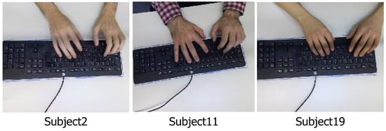 Identifying humans based on keystroke dynamics has gained increasing attention as a forensic tool in soft biometrics. The existing keystroke biometric systems can be divided into two categories: fixed text [] and free text []. Fixed text represents that the type of subject of the keystroke sequence is prefixed such as a password or username. Researchers [,] have studied keystroke biometrics based on fixed text to identify humans and the results can reach an accuracy rate of more than . However, the application scenarios of such methods are severely limited by the text content. Free text [] denotes the type of subject of the keystroke sequence, which can be any text, such as typing a sentence or writing an email. Murphy et al. [] applied Gunetti and Picardi’s algorithm based on the free text keystroke dataset for authentication, which can achieve a classification error of . However, it is far from the performance reached in the fixed text methods. Monaco et al. [] proposed an algorithm based on statistical models, which showed that the performance using this approach in free text is close to that of fixed text, but it requires more keystroke data. Acien et al. [] proposed a deep learning architecture for authentication and identification from 136 million keystrokes. Although it has the capability to achieve outstanding performance, it mainly relies on acquiring key press and release events, from which the following features can be extracted: interval, dwell time, latency, flight time, and up to up []. These features are easily affected by the velocities of typing, which are unstable and able to be forged. Moreover, recording these features requires keeping special software online, but the device usually shuts down, causing the software to go offline. More importantly, These features lack visual information, such as hand shapes and typing poses, which are important distinguishing characteristics of an individual. Therefore, we propose a visual modality of keystroke dynamics for human identification.