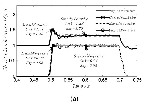 Effective values can be extracted from the instantaneous values of the short-circuit current of DFIG1 and DFIG4 measured using the full Fourier algorithm. Figure 7a,b show that the effective values of the short-circuit current of DFIG1 and DFIG4 at the 0.5 s fault instant are 2.25 p.u. and 1.76 p.u., respectively. However, the results calculated in this paper are 2.31 p.u. and 1.72 p.u., and the errors are only 2.7% and 2.4%. In the case of fault steady state, the error is only 1.7% and 1.4%. Therefore, the method proposed in this paper is effective.