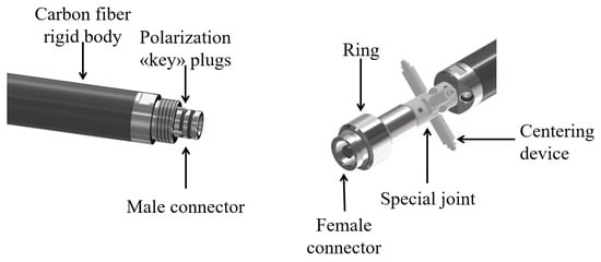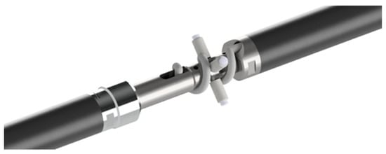 The position of the whole chain inside the tube is kept centered by means of a centering device that provides long-term stability avoiding unwanted movements of the nearby instruments. The device is composed of a Cardan joint and four spring plungers and is located exactly at the junction between two adjacent instruments (Figure 6). This connection does not create any bending in the elements nor interferences on the nearby probes along the chain. Additional details will be given in Section 4.