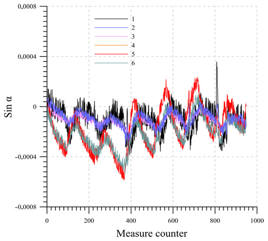 As an example, the results are presented for a system consisting of six probes, each measuring 0.5 m in length. The probes, thus simulating a real installation, are inserted from the top into a section of inclinometric tube that is 3 m long. The beams are numbered from 1 to 6, starting from the bottom of the chain. The temperature variation measured over the one-week period by each probe at equilibrium state is plotted in Figure 12. Figure 13 and Figure 14 display the readings of the six beams along the two directions A and B while Figure 15 reports the cumulative displacement variation for each channel over the same measured period. The chain behavior exhibited a highly cyclic pattern, with nearly identical readings observed upon the restoration of similar ambient conditions. It is worth noting that a slight alteration in the measurements of probe 1 occurred due to a minor impact on the tube, as evidenced by reading 832.
