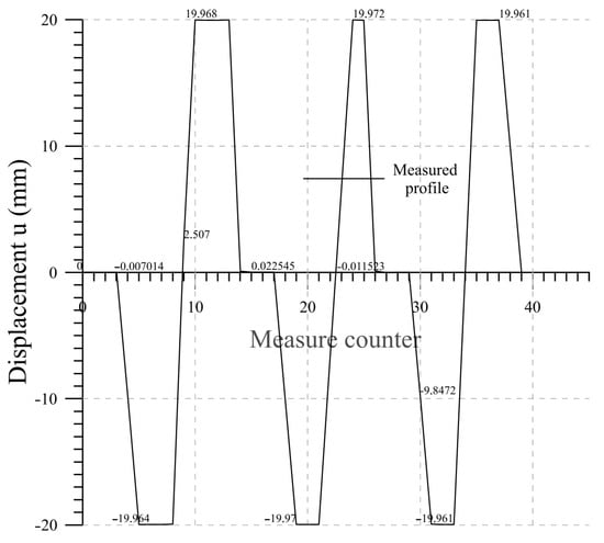 The performance of a single beam is investigated and determined. The free extremity of a beam is moved. This test verifies the correspondence between the imposed displacements and what is determined by the probe configuration estimating the accuracy of the sensor calibration, the effectiveness of the centering device, and the mechanical components. In Figure 16, the measures obtained in a ±40 mm imposed displacement cycle are reported. Measures determined at intermediate positions are also reported. Table 3 illustrates the results of a repeatability test determined on a 10 cycle with an amplitude of ±40 mm.