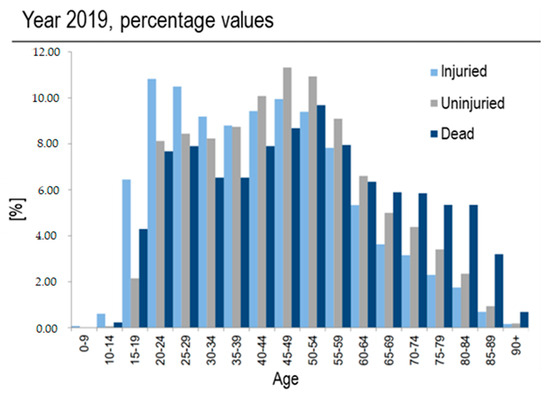 This conflict is already present, and to a greater degree, while learning to drive. Most people who register for a driving school do so in order to obtain a driving license, not to learn how to drive properly and safely. The result is a relative easiness in obtaining a driver’s license, but it is not necessarily true that being able to drive (thus licensed) corresponds to knowing how to drive properly and safely [4]. Not surprisingly, the highest percentage of drivers injured as a result of a traffic accident is found in the 20–24 age group, as reported by an Italian Government investigation (Figure 1, source: ISTAT 2019, the last report without the interference of restrictions due to COVID-19 pandemic) [5], and similarly confirmed also in other countries, at least in Europe [6]. Besides these reports, there is no doubt about the increased risk associated with young drivers worldwide [7], and the relevance of appropriate driving education to mitigate such concern.