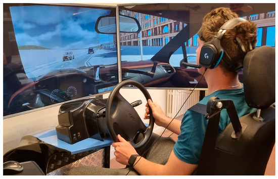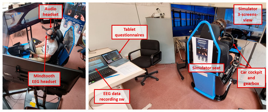 The experiments took place at the University of Burgos (Spain) and lasted almost 2 h per participant. One of the inclusion criteria was the absence of driving experience, since the main experimental objective was to validate the capability of assessing the trainees’ mental improvements while learning to drive. Therefore, the experiments were performed directly at the university in order to simplify the engagement of young adults without a driving license until that time. Two car simulators were set up in an artificially lighted room, as shown in the picture below (Figure 2). Each car simulator consisted of a realistic car cockpit, including a real car seat with safety belt, a pedal set, a manual gearbox, and a steering wheel with various actuators (directional indicators, lights, horn, etc.), and a three-screens display, in order to promote immersivity. Audio was provided through a headset, in order to isolate the participants from eventual acoustic interferences of the surroundings. During all the experimental tasks the participants’ brain activity was recorded through the Mindtooth Touch EEG wearable system (Brain Products GmbH. Gilching, Germany—BrainSigns srl. Rome, Italy). Such an EEG system, developed along the Horizon2020 European Fast-Track-to-Innovation Project Mindtooth (www.mindtooth.com, accessed on 10 October 2023, and https://mindtooth-eeg.com/ accessed on 10 October 2023), has been already successfully employed and validated in previous studies [49].
