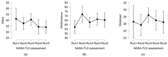 A subjective measure of ‘Workload’, has been obtained by averaging the six scores [64]. In addition, the ‘Effort’ and ‘Performance’ scales have been analyzed also singularly in order to evaluate the participant’s self-evaluation of the overall difficulty (the former) and the performance satisfaction (the latter).