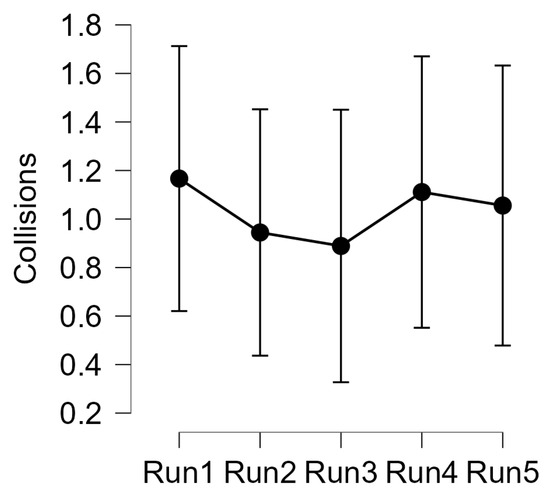 - Mental performance: the reaction times to the failure events were collected for each participant for each Run and averaged along the Run itself (there were two occurrence). In fact, the reaction to failures can be considered as a secondary task. According to the scientific literature related to the dual tasks interference, even while driving [65], with human mental resources being not unlimited, the more resources are allocated to the primary task, the more difficult it will be to manage a secondary task. Vice versa, the more experienced we become and able to perform the primary task automatically, the more we will improve our ability to handle secondary tasks, such as the reaction to additional and unexpected events. Therefore, a direct correlation was expected between improvement on the primary (driving) and the secondary (reaction to failure) tasks: the better the participant became at driving, the faster reaction times it would have to achieve.