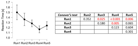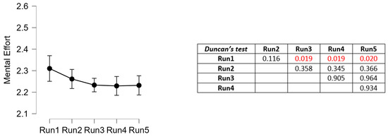 Analysis of the EEG-based mental effort scores (mean ± 95% confidence interval) with respect to the 5 runs of urban driving tasks. On the right, the p-values of the paired comparisons with the Duncan’s post hoc test (in red, the statistically significant values—p < 0.05).