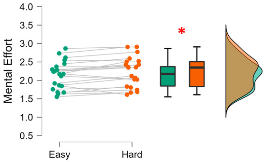 The statistical analysis confirmed this assumption, since the paired Student’s t-test (the distributions normality was verified, Shapiro–Wilk test: p = 0.343) showed that the EEG-based mental effort scores during the Hard task were significantly higher than during the Easy task (t = −2.807; p = 0.011; Cohen’s d = −0.613).