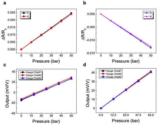 Changes in the relative charge in the gauge resistance with strain for (a) two tangential gauges and (b) two radial gauges. Variation in the output voltages under pressure for the four basic pressure sensors: (c) with an offset shift; (d) the bridge offset voltages were eliminated to show the span shift.