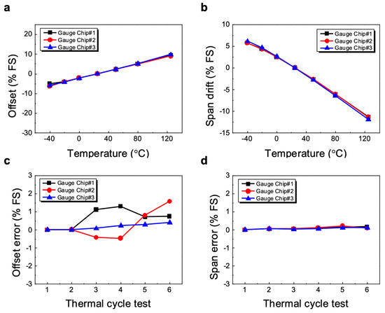 Figure 5c,d show the change in the zero offset and the span after several thermal cycles and shock tests, respectively. There was no change in offset after the high-temperature test (125 °C), but the offset for each device that passed the low-temperature test (40 °C) started to deviate from zero but remained within <2% FS. As shown in Figure 5d, in contrast to the offset, there is hardly any change in the span of the sensor even after each temperature cycle test, which is a characteristic observed in most silicon pressure sensors, because the sensitivity of the strain gauge depends mainly on the impurity concentration in the silicon, not from CTE mismatch. The above experimental results suggest that the long-term stability of a silicon gauge pressure sensor depends mainly on the offset voltage.