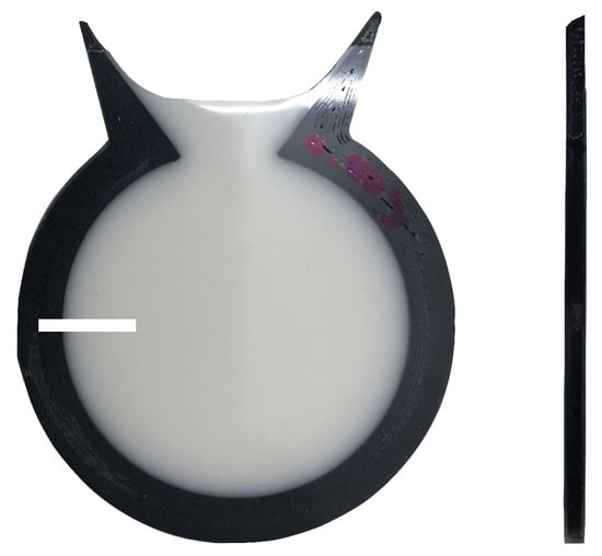 Front and side view with a scale bar of length 1 cm of an exemplary phantom made of epoxy resin filled in a 3D-printed flat open ring.