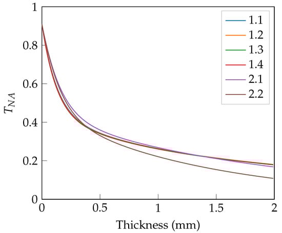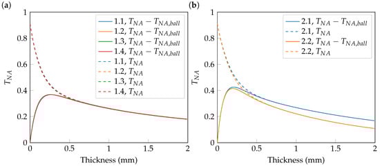 As is depicted in Figure 2, the (optically) thinner the sample, the more light is transmitted in and near the forward direction, increasing the amount of light transmitted into the numerical aperture. In Figure 3a,b, the for set 1 and set 2 is considered again in more detail. The two figures show the partial angular transmittance depicted over the sample thickness in mm. Together with the partial angular transmittance , the transmittance into the NA without any ballistic component given by and is of particular interest. It is important to note that nonballistic light does not equal diffuse light. This is considered in more detail below. The ballistic component is given by a delta peak in the forward direction of when illuminating the slab perpendicular to its surface normal.