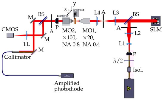 The system designed to undergo the following experiments is shown in Figure 4. A diode laser emits light at a wavelength of 633 nm that propagates through polarization optics at first. Adjusting the polarization is necessary because the SLM, located in the back focal plane of the first microscope objective, can only manipulate horizontally polarized light. The pixels of the SLM grouped into (N) square segments are arranged in a checkerboard pattern. Focused by the first microscope objective, the light transmits through the phantoms positioned so that the diameter of the illuminated area remains constant. Furthermore, the samples are always located in front of the focus concerning the optical axis. A consistently large illumination area allows a constant number of modes to be excited. However, the prerequisite is that the N segments remain linearly independent. This is tantamount to the light of neighboring segments not coupling into the same mode. More specifically, adjacent segments must have a sufficiently large k-vector spacing.