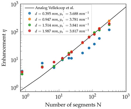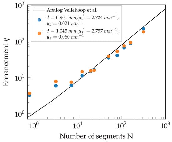 Adding a substantial amount of absorption in addition to the already present scattering in set 2 allows us to observe scattering and absorption effects in combination. The additional absorption lowers the total transmission but should not affect the measured enhancement because both the focal intensity and the background are damped similarly. Confirmation is given by the measurements depicted in Figure 6. The data points mostly overlap for the phantoms with different and agree well with the theoretically expected behavior following Equation (1).