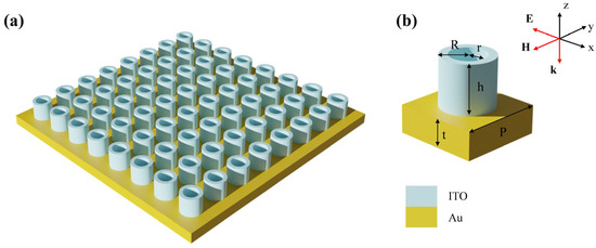 Various structures of narrowband absorbers have been proposed, including split-ring resonator arrays, metal–dielectric periodic gratings, metal–dielectric–metal and full-metal periodic configurations [17,18,19,20,21]. Meng et al. proposed using Ag grating and air medium-based surface plasmon resonance to achieve narrow-bandwidth absorption at 1400 nm with an FWHM of only 0.4 nm [17]. Liu et al. utilized a split-ring metasurface to design a refractive index sensor with an impressive FWHM of 8 nm and FOM of 56.5 1/RIU [19]. Fu et al. achieved exceptional absorption performance by preparing an Ag array absorber, which could reach 99.2% absorption with a remarkable FWHM of 24 nm [20]. Kang S et al. fabricated a cross-shaped nanoarray consisting of Au on a Si substrate, and deposited a thin layer of Au on the opposite side of the Si to impede transmission [21]. Experimental results have demonstrated that this absorber exhibited narrow-bandwidth absorption in the terahertz band. However, the inherent ohmic loss of metals, which are intensively applied in narrowband sensors, inhibits the resonance of plasmon due to joule and radiation losses. These losses can not only result in a widened spectrum of device characteristics, but also weakened response strength. Therefore, some researchers anticipate employing materials with minimal or negligible loss as alternatives for plasmon metals, such as Si [22], Ge [23], GaAs [24] and other semiconductor materials. In particular, heavily doped complementary metal oxide with low loss (i.e., TCOs) provides an additional option for plasmon resonance materials. These TCOs are degenerate semiconductors with carrier concentrations ranging from 1020 to 1021 cm−3. In general, TCOs mainly consist of Sn-doped indium oxides, Al- or Ga-doped Zinc oxides, and mixed families of these oxides. Indium tin oxide (ITO), as the most commonly utilized and relatively most mature commercial TCO film material, still holds great potential for use in scientific research. Li et al. demonstrated that by finely synthesizing ITO nuclear magnetic resonance through a random array of ITO nanorods, the intrinsic plasmon frequency can be altered to achieve surface plasmon infrared enhanced absorption [25]. In addition, Min et al. employed an ITO film to construct a multi-spectral integrated stealth device that exhibits low infrared emissivity and wideband microwave absorption, while simultaneously ensuring maximum visible light transparency in accordance with the engineering requirements of a multi-spectral integrated compatible design [26]. The viability of this design has been demonstrated. However, the above achievements have only focused on metasurfaces with broadband absorption. There are few studies exploiting ITO materials to achieve ultra-narrowband absorption in the near-infrared range.