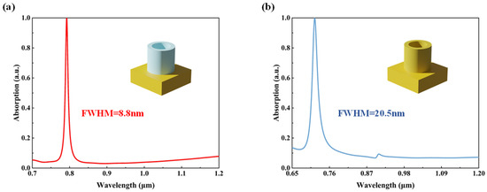 The INRR absorption spectrum is shown in Figure 3a, where the sharp resonance peak of complete absorption () occurs at a near-infrared wavelength of 792.2 nm, and the FWHM is only approximately 8.8 nm. In general, perfect absorption can also be achieved in the resonance mode based on a Au nano-resonance ring (ANRR). However, due to the inherent ohmic loss suffered by the metal, it is challenging for the ANNR to further compress the spectrum into a narrower FWHM. The INRR can effectively reduce dissipation loss and enable the perfect absorption of narrow line widths. To provide a comparison, we also calculated the absorption spectra of the ANNR, as depicted in Figure 3b. Compared with the INRR, this structure only alters the material of its top dielectric layer. It is evident that the ANRR exhibit a near-perfect absorption peak at 717.7 nm with an FWHM of 20.5 nm, which reveals the pivotal role played by the top INRR in achieving high and narrowband absorption in near-infrared wavelengths.