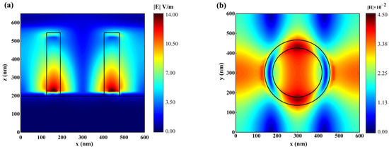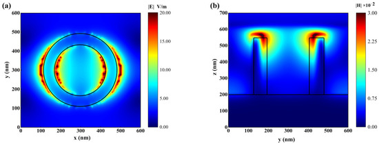 To unveil the underlying mechanism of absorption, we investigated the electromagnetic field response of the nanostructure at 792.2 nm. Figure 4a,b show the electric field along the x–z direction and the magnetic field along the x–y direction of the INRR, respectively. Notably, the intense electric field in the INRR is primarily localized at both ends of its diameter along the x direction, and is proximal to the interface between Au and ITO materials. The magnetic field induced by the strong electric field envelops and distributes perpendicularly in the direction of the electric field. Specifically, incident light stimulates non-uniformly localized electric fields along the x direction of the resonant ring, resulting in dissimilar charges being distributed on both sides of the inner diameter of the ring along this axis. Meanwhile, opposite charges are distributed on both inner and outer sides of the ring. A significant number of opposite charges are also present on the outer surfaces of different rings among the neighboring cells. The distribution of electric field is equivalent to the primary excitation of three pairs of electric dipoles within a cell, as well as an electric dipole between neighboring cells. These electric dipoles will further stimulate the magnetic field perpendicular to the plane of incidence for light. Therefore, the incident electromagnetic wave excites localized surface plasmon resonance (LSPR) in INRR. The response of free carriers to light at a specific geometric size is known as the LSPR effect. In the nanostructure, the LSPR is primarily composed of free electrons on the surface of the Au layer. Additionally, the ITO material promotes absorption by providing numerous free charges due to its high carrier concentration exceeding 4.509 × 1020 cm−3 [31]. Therefore, the device exhibits an infrared near-field enhanced absorption effect, resulting in the perfect absorption of near-infrared light with a wavelength of 792.2 nm. Due to the lower loss of the dielectric material, only the electromagnetic field close to the central wavelength can be localized here, leading to a relatively narrow FWHM.