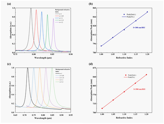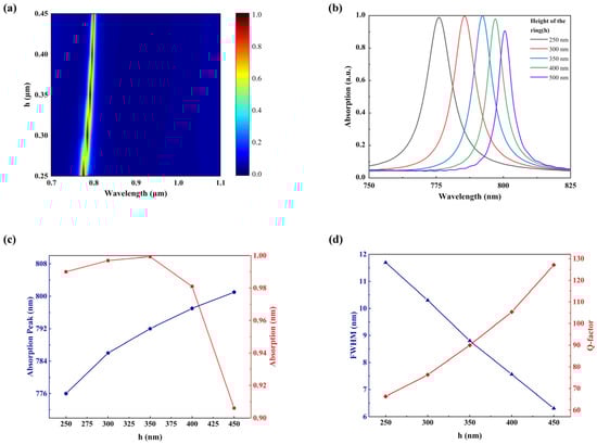 Figure 6 shows the impact of the INRR’s height on absorption efficiency. Figure 6a maps the impact of h on wavelength and absorption value, and Figure 6b shows the absorption spectrum of individual h. As illustrated, an increase in h results in a redshift of the resonance wavelength, followed by a decline in absorption rate after reaching its peak at . A nearly linear redshift of the absorption peak is observed in Figure 6c, while maintaining high absorption rates (>90%). Furthermore, Figure 6d presents the calculation of FWHM and Q-factors for absorption peaks at various h values. The performance factor Q of sensors is defined as [36,37,38], as represented by the blue line in Figure 6d. It can be noted that as the height increases, the optical path of light traveling through the material gradually increases, resulting in a more challenging excitation with a higher resonance intensity. However, the FWHM and Q-factor exhibit the opposite trend, while the narrowest FWHM is observed at , where an absorption intensity of only 90.5% is achieved. The competitive cooperation of FWHM and Q-factor implies that the absorption intensity cannot be overlooked in pursuit of a larger Q-factor, as it would compromise the perfect absorption characteristics of the structure.