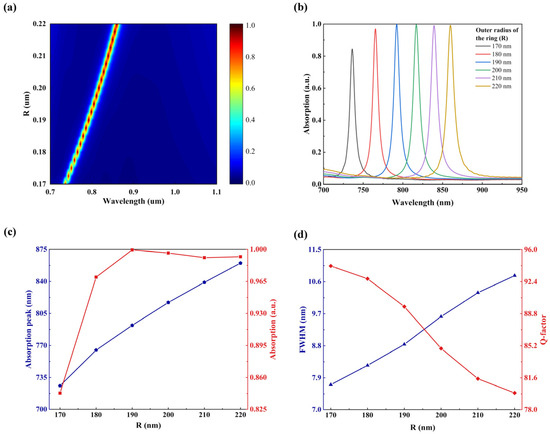 Subsequently, we proceeded to adjust the outer radius R of the INRR. As shown in Figure 7, with the increase in the ITO nano-resonant ring R, the filling ratio of the resonant ring on its surface gradually increases, resulting in great diversity between the inner and outer radii. Fundamentally, an increase in R leads to an increased interaction distance between different charges, which induces a smaller recovery coefficient (RC) for oscillating electrons in response. Additionally, relaxation effects caused by the nonuniform distribution of electric fields near the nanostructure result in redshift phenomena in the resonance peaks. It can be seen in Figure 7c that R exhibits a sharp increase beyond 170 nm. However, the absorption intensity begins to decline after reaching its peak at 190 nm. As shown in Figure 7d, the calculation results indicate that as the R is raised, there is a corresponding increase in FWHM and a decrease in the Q-factor, which demonstrates an inverse relationship.