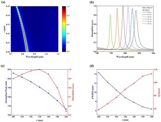 Dependence of absorption characteristics of INRR on inner radius r. (a) Absorption mapping with different r. (b) The simulated absorption spectrum of r from 100 to 150 nm. (c) The resonance wavelength (blue line) and absorption intensity (red line) corresponding to r. (d) The corresponding FWHM (blue line) and Q-factor (red line) as functions of r.