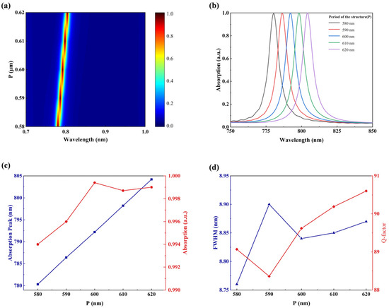 Dependence of absorption characteristics of INRR on period P. (a) Absorption mapping with different P. (b) The simulated absorption spectrum of P from 580 to 620 nm. (c) The resonance wavelength (blue line) and absorption intensity (red line) corresponding to P. (d) The corresponding FWHM (blue line) and Q-factor (red line) as functions of P.