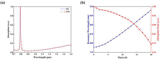 Finally, we study the effects of variations in the polarization and incidence angle of the refractive sensor. In practical applications, absorption spectra should remain robust when the two parameters are changed [42]. Hence, we investigated the spectral manifestations with respect to different polarization directions and the absorption spectra when varying oblique incidence angles, which are shown in Figure 11a,b. Our findings indicate that there is no discernible difference in absorption characteristics between TM and TE incident light, including when the position of the absorption peak, the absorption rate, and the FWHM remain constant. In nature, this highly polarization-independent property originates from the high degree of geometric symmetry in our designed INRR absorber. Figure 11b exhibits the variations in the resonance wavelength and absorption peak at different incidence angles (0° ≤ θ ≤ 20°). It can be observed that the absorption rates remain above 90% until θ < 13°, indicating the promising practical application of our sensor.