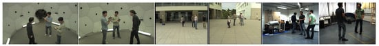 Due to the numerous real-world applications of 3D multi-view multi-person human pose estimation, such as human-computer interaction [], virtual and augmented reality [,], etc., the field of computer vision has seen significant research in this area [,,,], which has been driven by deep neural networks and large-scale human-annotated datasets [,]. These multi-view pose estimation methods have achieved excellent performance on the benchmark datasets [,], but still face challenges because of the wide variation in viewpoints, personal appearance, backgrounds, illumination, image quality, and so on. Due to unavoidable domain shifts, pose estimators developed for one particular domain (i.e., the source domain) may not generalize well to novel testing domains (i.e., the target domains). For example, a 3D pose estimator trained on the Panoptic [] dataset suffers a severe performance drop when evaluated on the Campus [] and Shelf [] datasets. In Figure 1, which shows several datasets used for 3D human pose estimation, we can see a considerable domain shift.