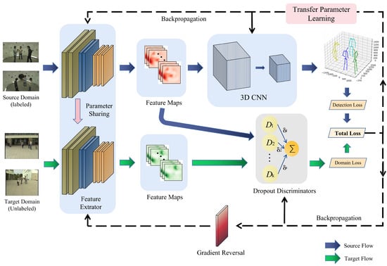 We add three elements to the VoxelPose model to minimize the domain divergence between two domains in order to correct the domain shift. First, we train a domain classifier [] using adversarial training to learn domain-invariant, reliable features. Second, we apply dropout to multiple discriminators by missing or dropping out each discriminator’s feedback with a specific probability at the end of each batch. This makes the feature extractor more domain-invariant by requiring its output to satisfy a dynamic ensemble of discriminators as opposed to a singular discriminator. Thirdly, we present Transferable Parameter Learning (TransPar) [] to eliminate the side effects of domain-specific information and enhance domain-invariant learning. TransPar divides all parameters into two categories: transferable parameters and non-transferable parameters. Consequently, TransPar provides distinct update rules for these two categories of parameters.
