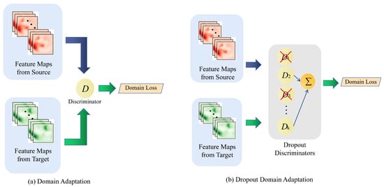 Deep learning algorithms are impacted by the domain-shift problem [,,], which manifests as networks trained on one distribution of data performing poorly on another distribution. This issue typically arises when models are deployed in circumstances that are marginally different from those in the training set. The data from various domains is aligned so that the resulting models have strong generalization performance, which is how unsupervised domain adaptation approaches are typically used to solve this problem. Existing theoretical works can be broadly classified into two types: distance measurement methods and adversarial learning methods. (1) Method based on distance measurement. By reducing the Maximum Mean Discrepancy [,], investigate domain-invariant feature learning. (2) Method based on adversarial learning. Inspired by GANs [], adversarial learning was used to align feature distributions across several domains on various 2D vision tasks [,,,,]. Applying dropout to each discriminator’s feedback [] allows the generator to satisfy a dynamic ensemble of discriminators rather than a static single discriminator, which motivates us to include dropout mechanisms in our domain adaptation component.