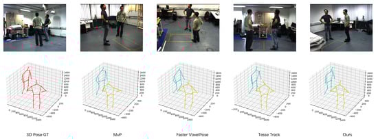 3D pose estimation from monocular inputs [,,,,,,,,] presents an ill-posed problem, as multiple 3D predictions can correspond to the same 2D projection. Multi-view approaches have been developed to alleviate such projective ambiguity. Some methods aggregate data from multiple cameras, utilizing camera settings to identify matching epipolar lines between various views []. Additionally, existing camera parameters can be leveraged to generalize new camera setups not present in the training data [,]. However, the complexity increases significantly when approaching multi-person scenarios. For multi-person tasks, current approaches mostly use a multi-stage pipeline, including reconstruction-based [,,,,,], volumetric paradigms [,], and regression-based approaches []. Using a combination of geometric and appearance signals as well as the cycle-consistency constraint, [] matches 2D postures across several views. Ref. [] proposes a two-stage volumetric paradigm that circumvents the cross-view matching problem, thereby decreasing the impact of erroneously created cross-view correspondences. Ref. [] shows skeleton joints as learnable query embeddings and lets them gradually attend to and reason over the multi-view information from the input images to directly regress the actual 3D joint location.