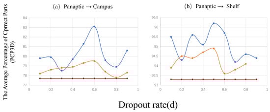 An illustration of the Average Percentage of Correct Parts (PCP3D) on the Campus and Shelf datasets, with the Dropout Rate (d) plotted on the horizontal axis and PCP3D on the vertical axis. The methods are distinguished by color: the red line for the DA baseline method, the yellow line for the dropout DA method, and the blue line for our proposed full method with TransPar.
