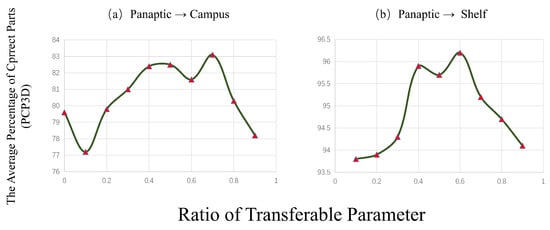 The Average Percentage of Correct Parts (PCP3D), based on Wider Ratios of Transferable Parameters, on Campus and Shelf dataset.