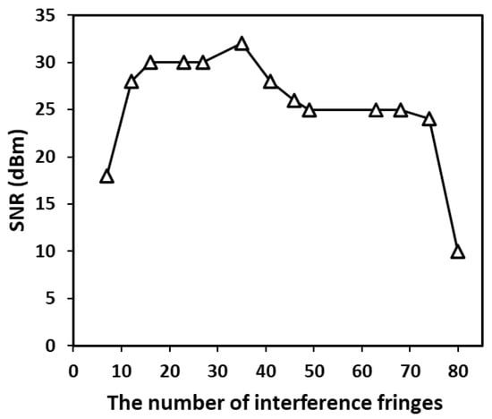 Figure 3. The number of fringes can be changed by adjusting the mirrors. As the number of fringes increases, the signal-to-noise ratio first increases and then decreases. When the number of fringes is less than 10 and greater than 80, the signal-to-noise ratio is relatively low. When the number of interference fringes is between 20 and 45, the signal-to-noise ratio is relatively good.