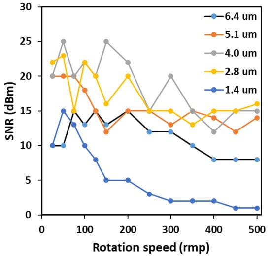 Figure 4. Regardless of the fringe spacing, the signal-to-noise ratio tends to decrease with increasing speed. When the fringe spacing is appropriate, the overall signal-to-noise ratio is higher. When the fringe spacing is 2.8 um and 4.0 um, the signal-to-noise ratio of the signal is higher. This conclusion is consistent with the conclusion in