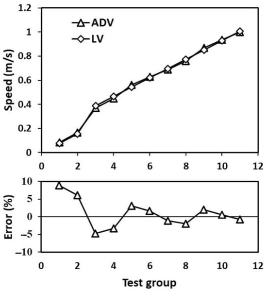 To verify the accuracy of the laser velocimeter (LV) in measuring the water flow velocity, an acoustic Doppler velocimeter (ADV) was used to conduct a comparison test on the velocity of 0.1–1 m/s at the China Institute of Water Resources and Hydropower Research. The flow velocity measurement range of the ADV is 0–3 m/s, with a measurement accuracy of ±0.5% and a sampling frequency of 100 Hz. During testing, the ADV was fixed in the water tank which can generate a relatively stable water flow. The LV was installed on one side of the water tank, and the laser emitted by the system was injected into the water through the organic glass side wall of the water tank. We set 11 speed nodes and after the flow rate stabilized, we simultaneously sampled and measured the flow rate. Each sampling time was 3 min, and the test results are shown in