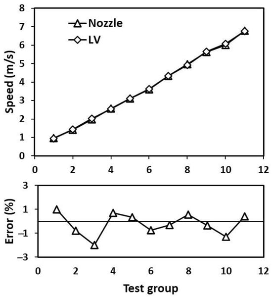 The nozzle method was used to compare and test the flow velocity in the high-speed range of 1–7 m/s. The special device of the system ensures the uniform distribution of the nozzle flow velocity. During the test, the instrument was installed above the nozzle, and the laser emitted by the system was focused on the water. The nozzle standard flow rate system was set with 11 speed nodes, and the laser velocity measurement system measured the flow rate at the nozzle. At present, the maximum flow rate of this flow rate calibration device is 302 L/s, equivalent to 9.7 m/s. The speed value set by the nozzle standard flow rate system was compared with the data measured by the laser velocity measurement system. The experimental results show that the maximum measurement error of the system in the high-speed section is 1.98%, as shown in