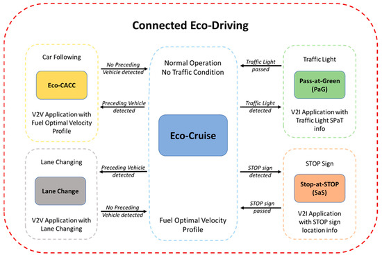 Other than the roadway infrastructure, CAVs also interact with other surrounding traffic agents. CAVs are equipped with perception sensors; hence, they can detect nearby objects or vehicles. For the Eco-Driving of a CAV, once the ego CAV detects a preceding vehicle, it needs to go into Eco-Cooperative Adaptive Cruise Control (Eco-CACC) mode (the light-orange-colored block in Figure 1). This mode uses V2V communication so that the ego CAV obtains the preceding vehicle’s information and uses that information to follow the preceding vehicle in a fuel-efficient manner.