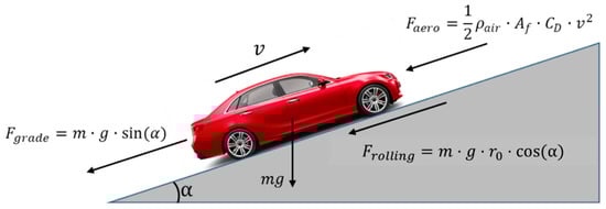 The road load (Figure 2) equation given in (1) has three parts. The first part is the rolling resistance , and this term depends on the tire properties, vehicle speed and road conditions. In Equation (2), is the vehicle mass with the rotating inertia factor, is a parameter of the rolling resistance equation and is the road grade. The second term is and refers to the aerodynamic drag term. depends on the vehicle speed and frontal cross-section area of the vehicle. In Equation (2), is the density of air, is the front cross-sectional area, is the drag coefficient and is the vehicle speed. is the road grade term, and it depends on the vehicle mass and the road grade.