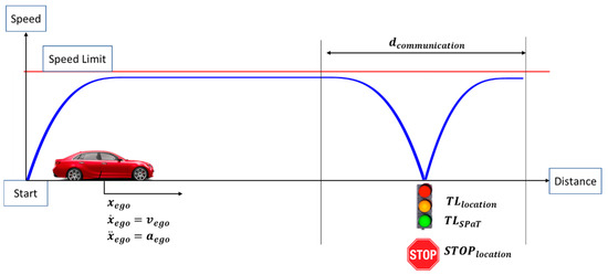 A vehicle traveling from a starting location to a traffic light (or a STOP sign) can be seen in Figure 3. In Figure 3, is the position, is the speed and is the acceleration of the ego vehicle. is the traffic light location, is the traffic light state and duration and is the location of the STOP sign.