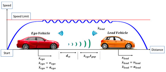 An ego CAV following a lead connected vehicle can be seen in Figure 4. and are the positions of the ego and lead vehicles, respectively. and are the speeds of the ego and lead vehicle, respectively. and are the accelerations of the ego and lead vehicle, respectively. It should be noted that the sinusoidal-looking perturbation in the speed profile of Figure 4 is for illustration purposes only and represents a perturbation (not necessarily sinusoidal) that the ego vehicle does not want to follow.
