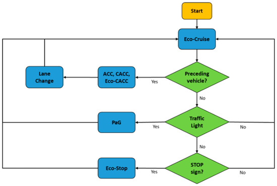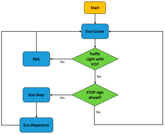 Depending on deterministic conditions, such as the current upcoming traffic light state and duration, the distance between the infrastructure elements (the traffic lights and STOP signs) and the ego vehicle, as well as the instantaneous vehicle speed, the controller is tasked to make a decision to switch between driving modes. The flow chart for the deterministic control algorithm for the fuel-economic Eco-Driving of a single CAV with no traffic can be seen in Figure 5.