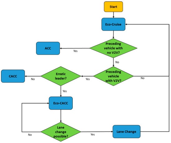 This High-Level (HL) controller for V2V with traffic aims to make transitions between driving modes correctly and smoothly so that the ego vehicle speed does not jump abruptly when the driving mode changes. The flowchart for the controller is seen in Figure 6, where the Eco-Cruise speed is the fuel-economic and road-dependent speed profile for the ego vehicle to follow to consume less fuel. When there is a preceding vehicle with no V2V communication, the ACC model is activated and the ego CAV safely follows the lead vehicle. If the preceding vehicle is equipped with V2V and does not have an erratic driver, then the CACC takes over and follows the lead vehicle smoothly while keeping a safe distance between vehicles to prevent a collision. If the preceding vehicle with V2V has an erratic driver, then Ecological Cooperative Adaptive Cruise Control (Eco-CACC) takes over control to follow the erratic leader without responding to its high-frequency accelerations in order to maintain fuel savings and safety. If the leader is erratic and lane changing is possible for the ego vehicle, then the ego vehicle changes its lane and maintains the Eco-Cruise speed.