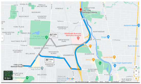The simulation environment designed in Vissim is called the Arlington Route and it has one STOP sign, five traffic lights and is 6873 m long. The Arlington Route can be seen below in Figure 8.