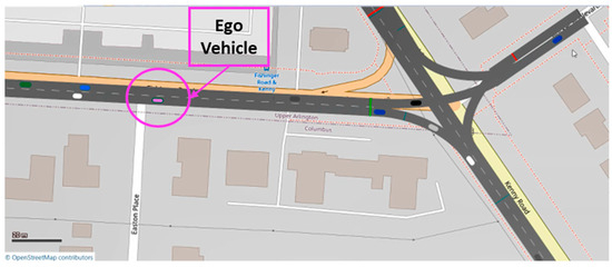 The pink ego vehicle approaching a traffic light at an intersection with other traffic vehicles around it during the traffic simulation can be seen in Figure 10. During the simulation, the ego vehicle was controlled by the HL controller to save fuel by smoothly approaching traffic lights and STOP signs. At the same time, whenever there was a vehicle in front of the ego vehicle and the distance between the ego and lead vehicles was less than 50 m, ACC, CACC or Eco-CACC were activated to prevent collisions between the vehicles during car following.