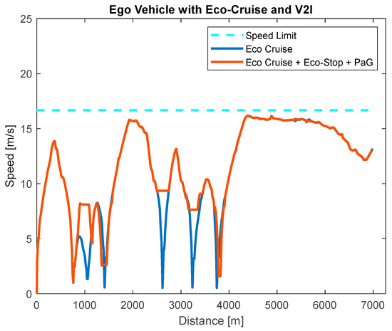 For the second case, the ego vehicle was commanded to follow the same Eco-Cruise speed as the first case while also interacting with STOP signs by using Eco-Stop and traffic lights by using PaG. For case 2, the HL controller for V2I with no traffic presented in Section 3.1 was utilized during the simulations.