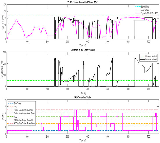 The results of the third simulation case, where there were other traffic vehicles in the traffic simulator and the ego vehicle was equipped with the V2I algorithms and ACC, can be seen in Figure 12. Whenever the distance between the ego vehicle and the lead vehicle was below 50 m, the ACC took over control to make sure no collision could occur. If the distance between the ego and the lead vehicle was larger than 50 m, the HL controller commanded the ego vehicle to either follow the Eco-Cruise trajectory or the PaG trajectory to save fuel. During this simulation, around 500 s, the PaG commanded the vehicle to accelerate to pass the traffic light, which was not observed in cases 4 and 5. This acceleration-to-pass behavior observed in case 3 resulted in the ego vehicle having the highest fuel consumption among cases 3, 4 and 5.