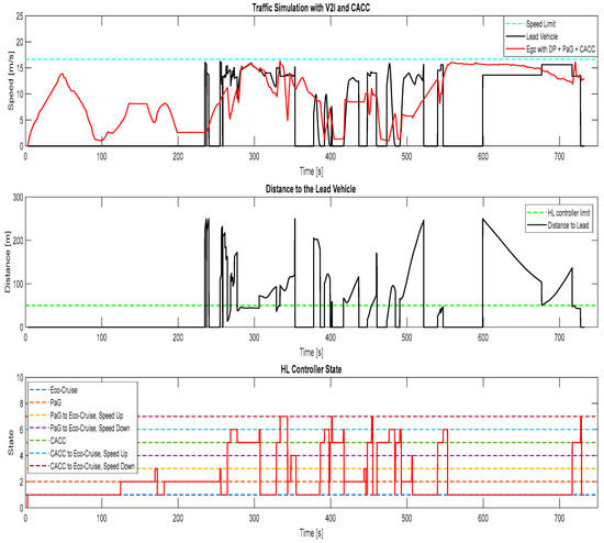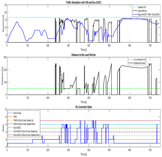 The results of the fifth and the final simulation case, where there were other traffic vehicles in the traffic simulator and the ego vehicle was equipped with the V2I algorithms and Eco-CACC, can be seen in Figure 14. Similar to the previous cases with ACC and CACC, the HL controller handled the state transitions.